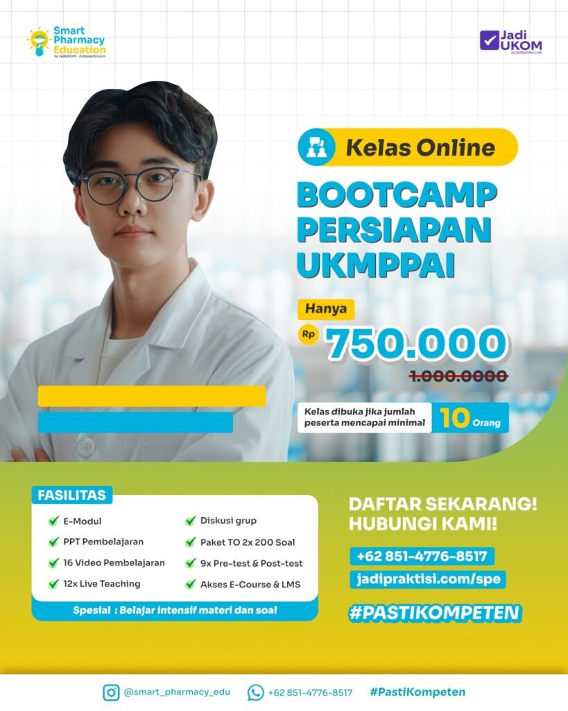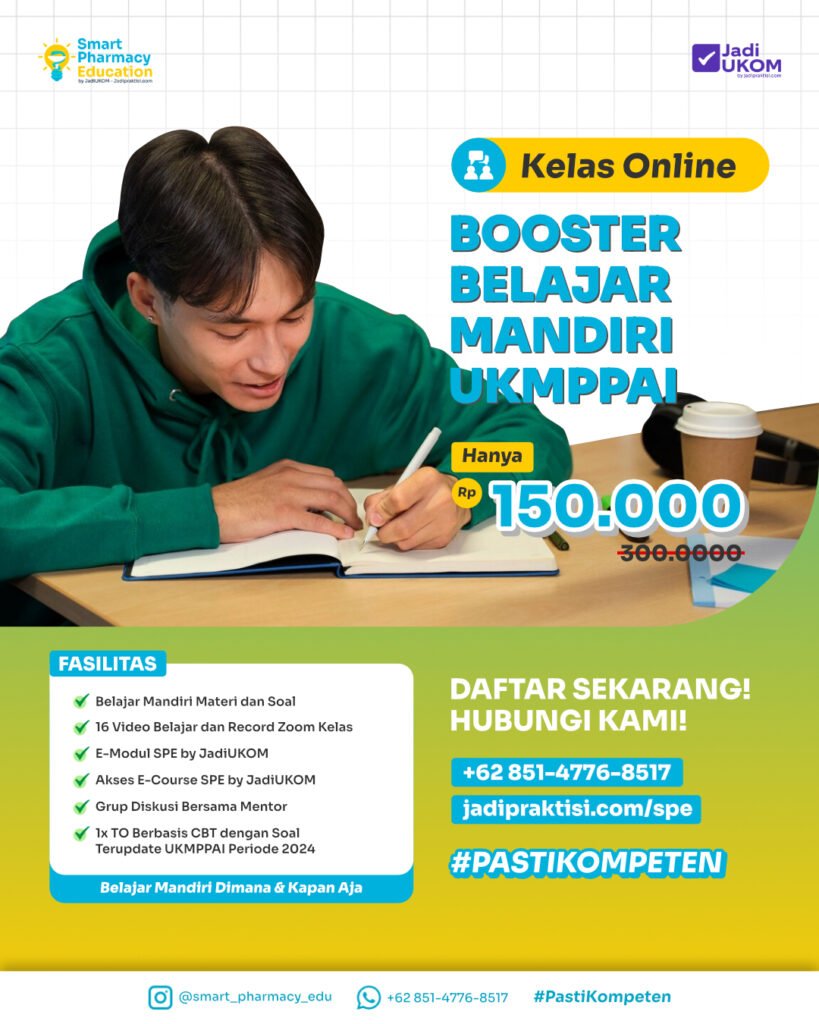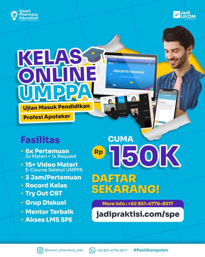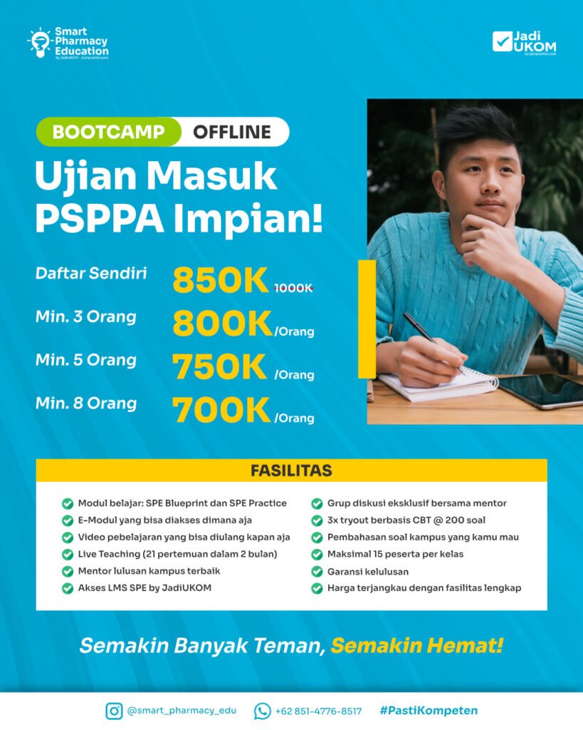 Smart Pharmacy Edu merupakan program pendampingan buat kamu untuk mempersiapkan seleksi masuk program studi pendidikan profesi apoteker (UM-PSPPA) dan uji kompetensi mahasiswa program profesi apoteker indonesia (UMPPAI) secara mudah dan #PastiKompeten!
